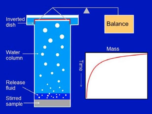 通過(guò)水柱上升的氣泡被收集到一個(gè)倒置的皿(浮皿)中,這個(gè)皿是浸在水中并且連接到一個(gè)靈敏的天平。當(dāng)氣泡聚集在皿上時(shí),由于水被空氣替代,皿的表觀質(zhì)量會(huì)降低。皿的表觀質(zhì)量會(huì)隨時(shí)間記錄下來(lái)。