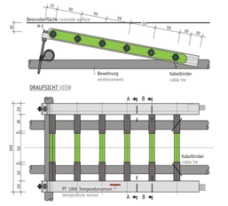 自1990年以來,陽極梯已經(jīng)被各地應(yīng)用于鋼筋混凝土和預(yù)應(yīng)力混凝土結(jié)構(gòu)的銹蝕監(jiān)測。它由6個鋼質(zhì)陽極、1個氧化鈦陰極,以及1個PT1000溫度傳感器組成。鋼質(zhì)陽極裝在不銹鋼框架內(nèi),放置在外層鋼筋與混凝土表面之間的不同深度處。陽極的位置可以在混凝土保護層內(nèi)調(diào)整。為確保陽極梯能夠進行長期監(jiān)測,采用了聚四氟乙烯涂層的電纜,以及電纜長度進行了冗余考慮。